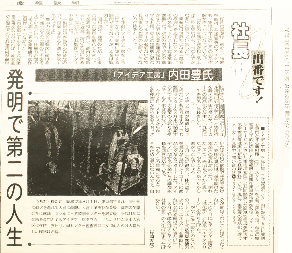 そして平成19年3月9日、「集塵機及び集塵作業者」が新案特許第3926337号で試作品の第一号機が認可されました。