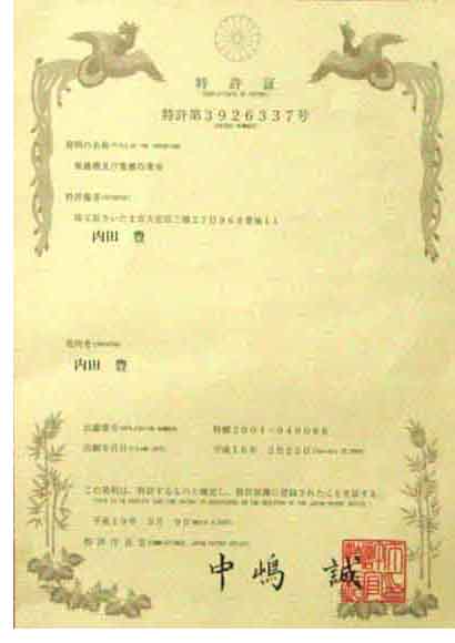 私どもの「落葉集塵機の試作品」が皆様の発展向上をめざして研究し、商品開発活動を続けております。お陰様をもちまして、平成19年3月9日付にて新案特許第3926337号で認可されました。